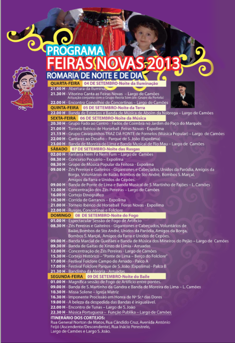 Os primeiros sons das tradicionais festas do concelho de Ponte de Lima, são entoados pelo popular cantor Vitorino que canta as Feiras Novas, dia 4 de setembro, às 21h30, no Largo de Camões. A atuação conta com a participação do Grupo Recria Som, seguindo-se o tradicional Encontro Concelhio de Concertinas, esperando-se uma grande afluência de tocadores de concertina.
