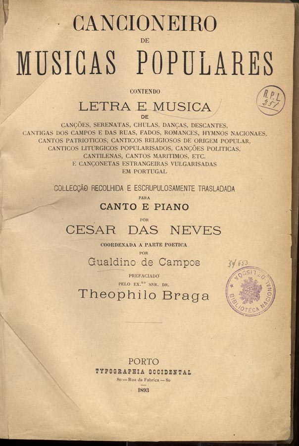 O “Cancioneiro de Músicas Populares” constitui uma obra rara e de elevado interesse sobretudo para os estudiosos da nossa etnografia. Publicada em três volumes, compilando uma colecção de fascículos editados entre os anos 1893 e 1899 e impressos na Typografia Occidental, da cidade do Porto, contém “letra e musica de canções, serenatas, chulas, danças, descantes, cantigas dos campos e das ruas, fados, romances, hymnos nacionaes, cantos patrioticos, canticos religiosos de origem popular, canticos liturgicos popularisados, canções políticas, cantilenas, cantos maritimos, etc. e cançonetas estrangeiras vulgarizadas em Portugal”, recolhida por César A. Das Neves, coordenada a parte poética por Gualdino de Campos e prefaciada pelo Dr. Teophilo Braga.