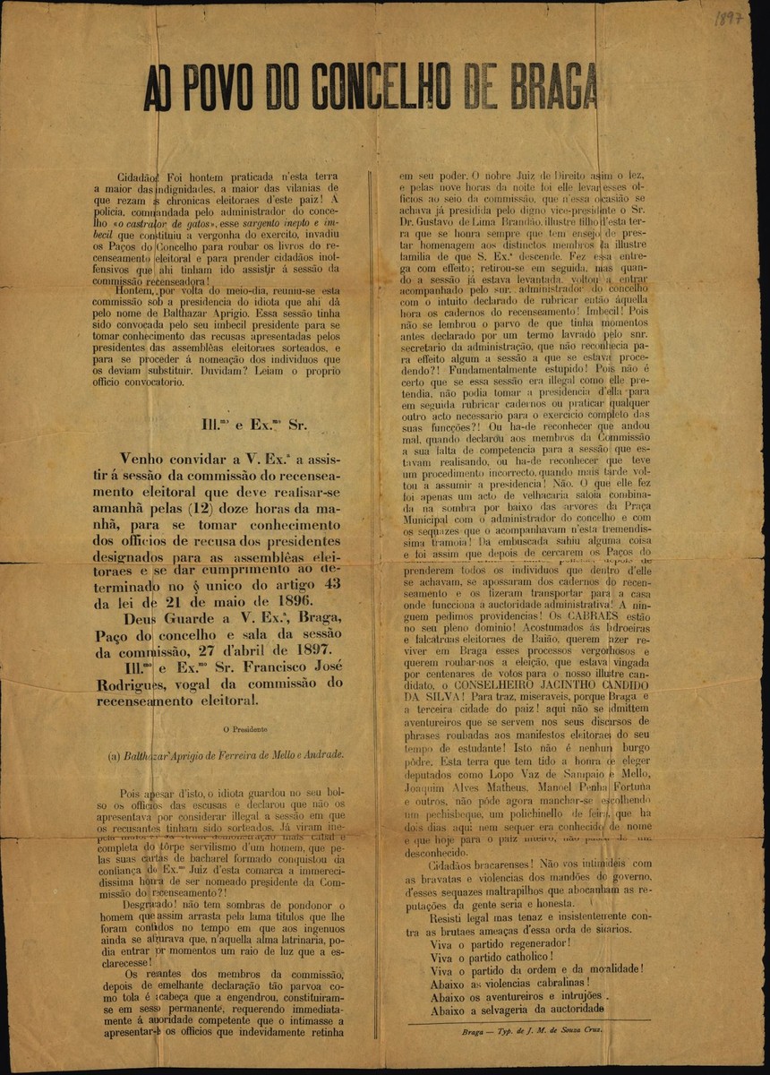 A gravura reproduz o comunicado do Partido Regenerador contra Balthazar Aprigio, Administrador do Concelho de Braga, pelas suas interferências no processo eleitoral ali realizado em 1897.