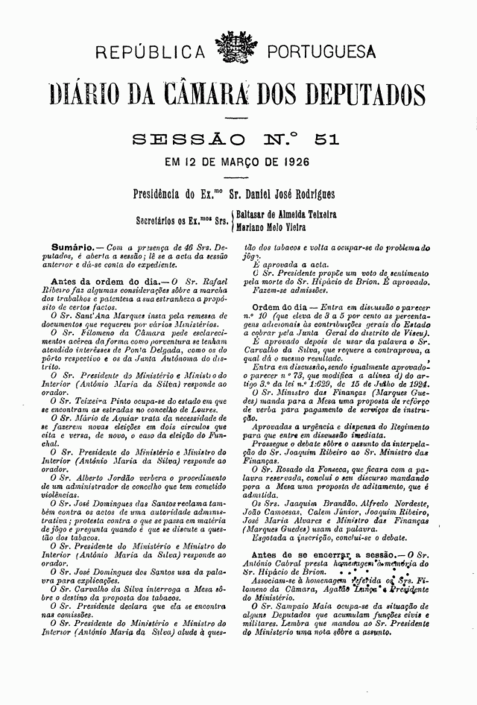Na Sessão da Câmara dos Deputados realizada em 12 de Março de 1926, sob a presidência de Daniel José Rodrigues, o deputado José Domingues dos Santos protestou contra as arbitrariedades cometidas pelo então Administrador do Concelho de Arcos de Valdevez que, segundo o referido parlamentar, agrediu e expulsou os vereadores do edifício municipal. Escassos meses depois, foi implantada a ditadura militar que veio a abrir o caminho para o estabelecimento do Estado Novo…