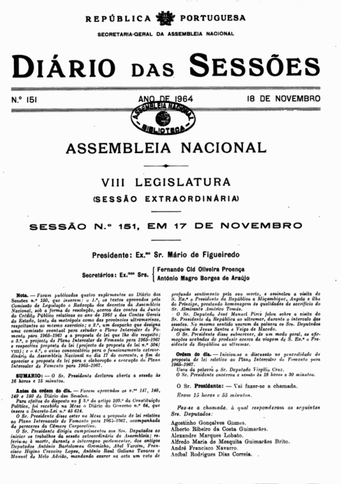 Em 17 de Novembro de 1964, foi apresentado à Assembleia Nacional a Proposta de Lei relativa ao “Plano Internacional de Fomento para 1965-1967”, acompanhada dos respectivos pareceres da Câmara Corporativa. Tratava-se de uma Sessão Extraordinária referente à VIII Legislatura, cujos trabalhos são descritos no Diário das Sessões nº. 151, de 18 de Novembro.