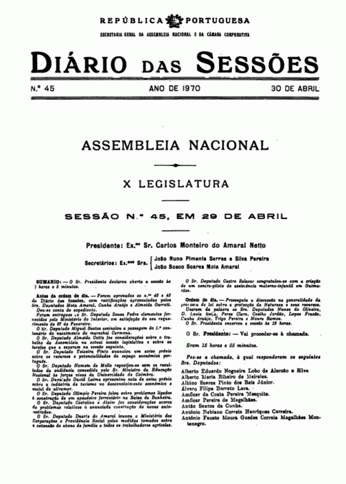 Em relação à sessão da Assembleia Nacional da qual se transcreve uma passagem da intervenção do Dr. Nunes de Oliveira, a mesma era presidia à referida sessão Carlos Amaral Netto, e secretariada por Silva Pereira e Mota Amaral.