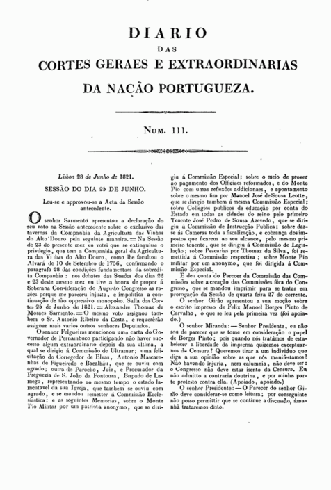 Deos guarde a V. Exca. Paço das Cortes, em §5 de Junho de 1821. - João Baptista Felgueiras.
