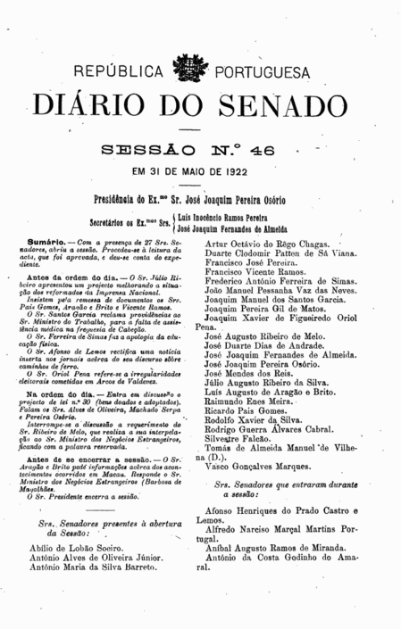 “Sr. Presidente: o Ministério continua a brilhar pela sua ausência, e contra isso protesto eu. Desejaria que estivesse presente qualquer membro do Govêrno para que transmitisse ao Sr. Presidente do Ministério e Ministro do Interior uma reclamação. Como, porém, tal não sucede, e o assunto urge, pedia a V. Exa., Sr. Presidente, se desempenhasse de tal missão.