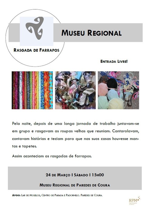 O Museu Regional de Paredes de Coura leva a efeito no próximo dia 24 de março, pelas 15horas, uma “Rasgada de Farrapos” à moda antiga. Vão participar nesta iniciativa os utentes do Lar de Mozelos e dos Centros de Parada e Padornelo.