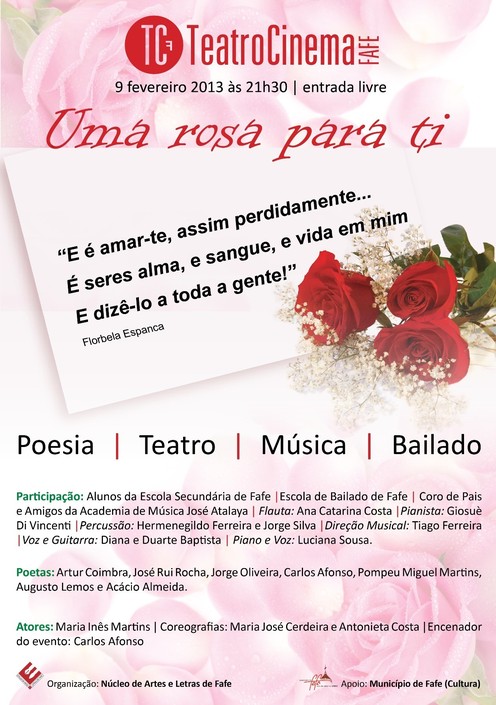 Poesia, teatro, música e bailado são os ingredientes essenciais do espetáculo “Uma Rosa para Ti”, que o Núcleo de Artes e Letras de Fafe promove no próximo dia 9 de Fevereiro, sábado, no Teatro-Cinema de Fafe, a partir das 21h30.