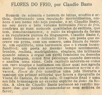 Publicou a revista Ilustração Portugueza na sua edição de 17 de fevereiro de 1923 uma crítica literária à obra “Fores do Frio”, do escritor vianense Cláudio Basto, cuja imagem junto reproduzimos.