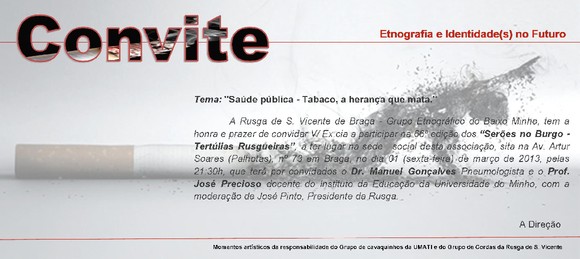 A Rusga de São Vicente de Braga - Grupo Etnográfico do Baixo Minho, leva a efeito na 66ª edição dos "Serões no Burgo/Tertúlias Rusgueiras", a ter lugar na sede social desta associação, sita na Av. Artur Soares (Palhotas) nº 73 em Braga, no dia 1 de março, pelas 21:30h, que terá por convidados: Dr. Manuel Gonçalves Pneumologista e o Prof. José Precioso docente do Instituto da Educação da Universidade do Minho, cujo tema será:
