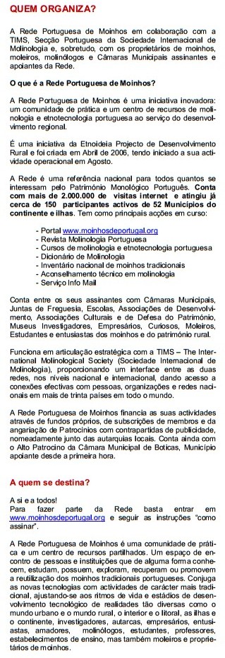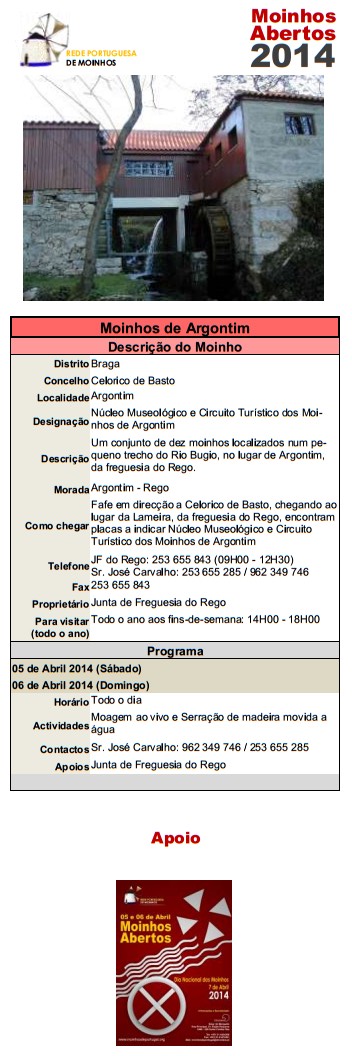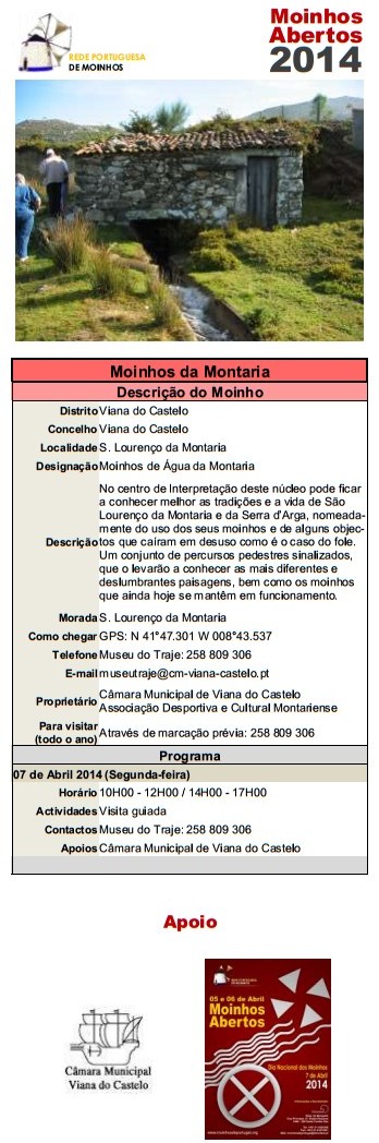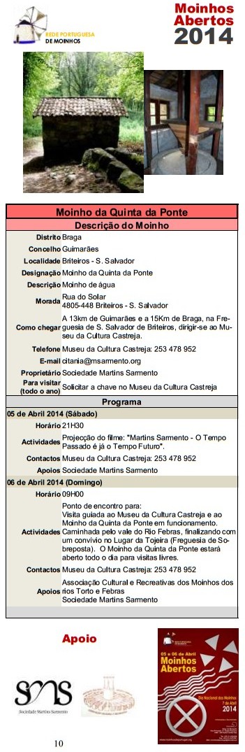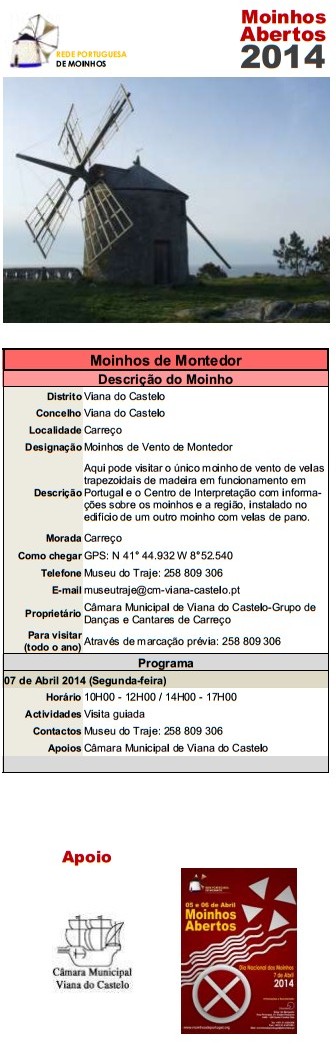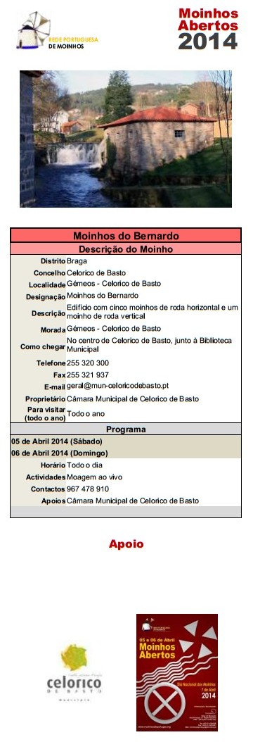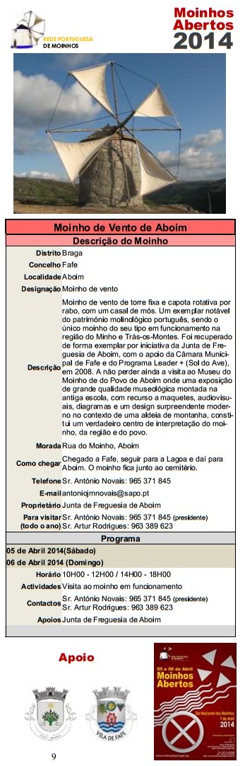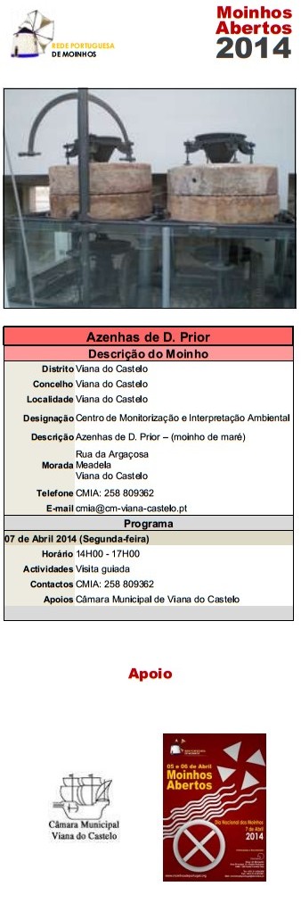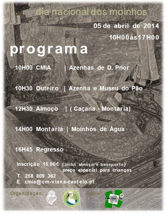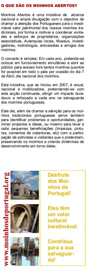 Após o sucesso de 2013 voltamos a assinalar o Dia Nacional dos Moinhos e a organizar, em todos o país, a iniciativa Moinhos Abertos de Portugal nos dias 5,6 e 7 de Abril (sábado, domingo e segunda) de forma a permitir a participação de todos.