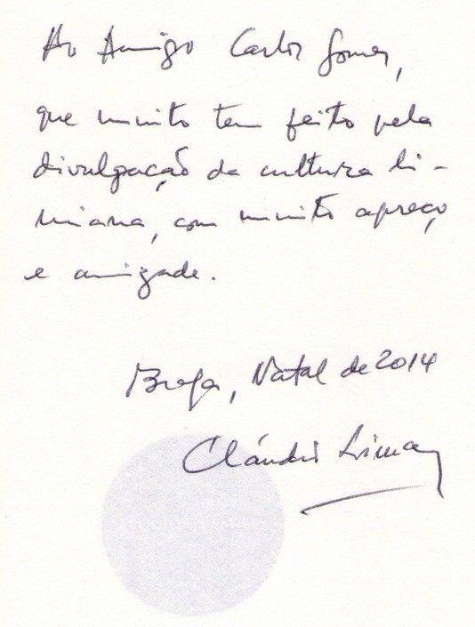 O poeta Cláudio Lima acaba de publicar mais um magnífico livro de poemas com o talento e beleza a que há muito nos habituou. Trata-se de “Elogios / Elegias”, uma edição da Editora Labirinto, prefaciado por Vítor Aguiar e Silva, obra que recebeu a Menção Honrosa no Prémio de Poesia Soledade Summavielle 2014, atribuído pelo Núcleo de Artes e Letras de Fafe.