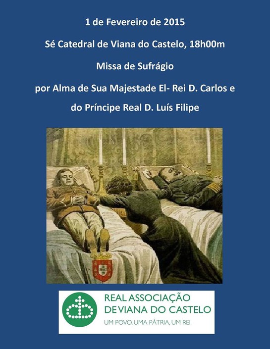 A Real Associação de Viana do Castelo manda celebrar no próximo dia 1 de Fevereiro de 2015, às 18h00m na Sé Catedral de Viana do Castelo, uma Missa de Sufrágio por Alma de Sua Majestade El-Rei Dom Carlos e do Príncipe Real Dom Luís Filipe, bárbara e covardemente assassinados, por amor à Pátria no dia 1 de Fevereiro de 1908, no Terreiro do Paço em Lisboa.