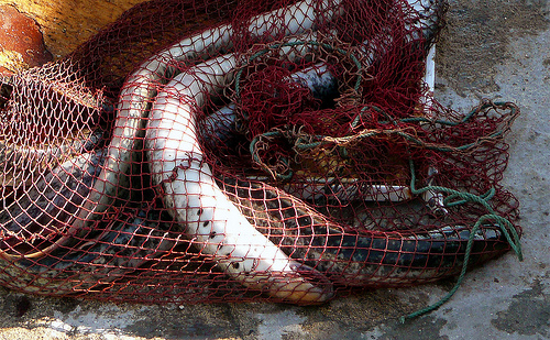 Também a fisga certeira, atirada, firme, dos altos, se os olhos penetrantes do pescador distinguem bem o vulto ondeante, faz içar a lampreia até às mãos ávidas, e lança-a, depois, para a vastidão de um saco que se quer a abarrotar.