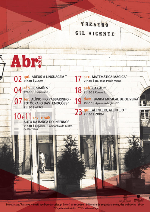 O teatro regressa ao palco nos dias 7, 10 e 11 de abril. No dia 7, é a vez da peça "Alípio Pio Passarinho - Fotógrafo das Emoções”, pela APACI; nos dias 10 e 11 de abril estará em cena a peça “Auto da Barca do Inferno”, de Gil Vicente, pela Capoeira - Companhia de Teatro de Barcelos. Todas com início às 21h30.