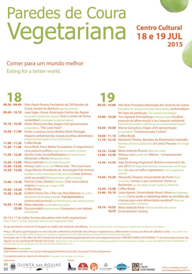 A atriz e realizadora Sandra Coias, o ator Heitor Lourenço, bem como Alexandra Teixeira da Universidade do Porto, Luísa Agante da Universidade Nova de Lisboa e Jorge Ribeiro da Associação Vida Animal, assim como o ‘vegetarian butcher’ e empresário do ano 2015 Jaap Korteweg, Anna Mulà da Franz Weber Foundation e Marianne Thiem do Parlamento da Holanda são alguns dos intervenientes do Congresso Internacional ‘Paredes de Coura Vegetariana’, que vai decorrer no fim-de-semana de 18 e 19 de julho no Centro Cultural desta vila do Alto Minho.