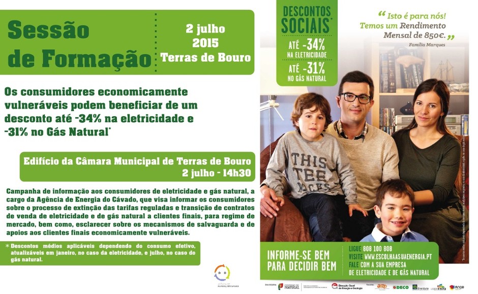 O Município de Terras de Bouro e a Agência de Energia do Cávado – AEC, em colaboração com a Direcção-Geral de Energia e Geologia (DGEG) e com a RNAE - Associação das Agências de Energia e Ambiente (RNAE), irão promover uma sessão de esclarecimento junto das populações, com vista a informar os consumidores sobre as novas condições de acesso aos descontos sociais de eletricidade e gás natural e sobre o mercado liberalizado da energia.