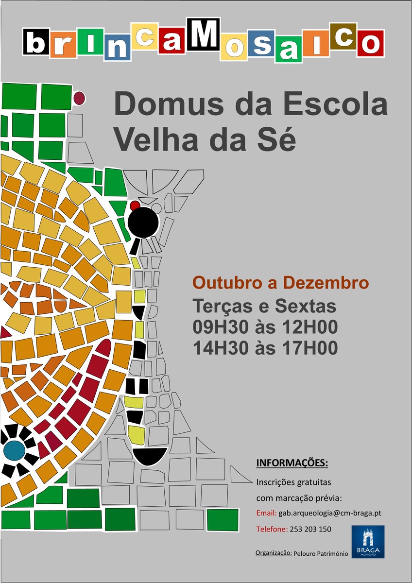 No âmbito da promoção e divulgação do espaço museológico “Domus da Escola Velha da Sé”, o Município de Braga, promove, entre os meses de Outubro e Dezembro a actividade “brincaMosaico”, que consiste na promoção de um conjunto de ateliês, onde serão abordadas técnicas de execução de um mosaico romano, materializando-se na criação de um pequeno painel.