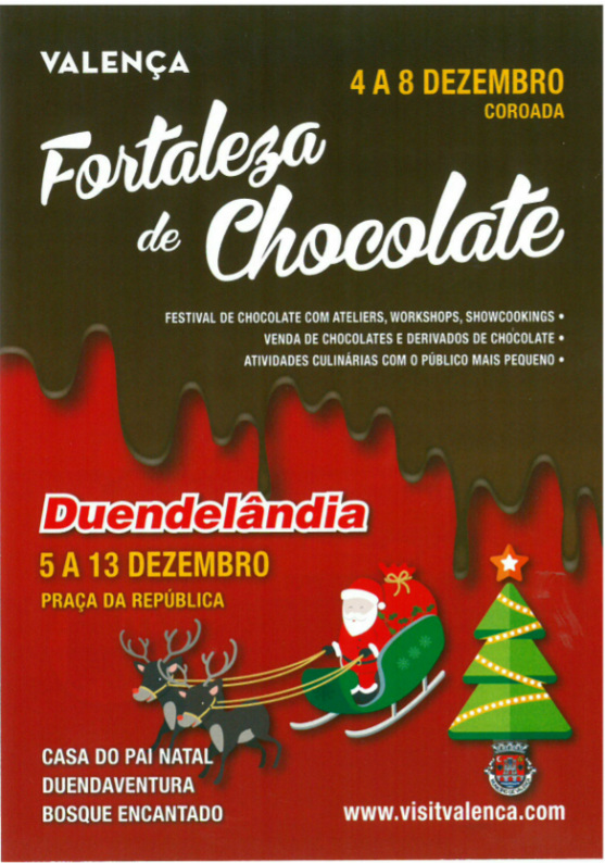 A Fortaleza de Chocolate adoçará o Natal entre 4 e 8 de dezembro. Uma oportunidade para deliciar-se, em Valença, com os os licores, as pizzas, os crepes, os gelados artesanais, as espetadas de fruta, os waffles, os cupcakes e cakepops, o vinho e muito mais, tudo com chocolate.