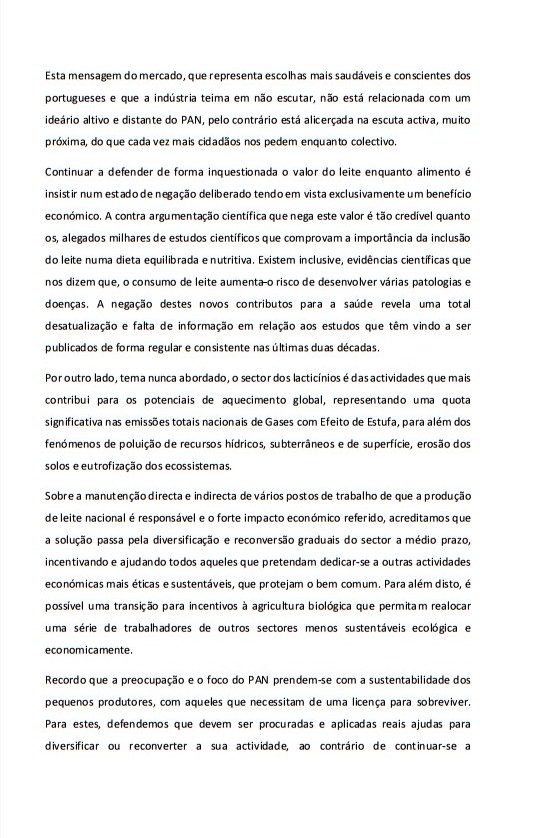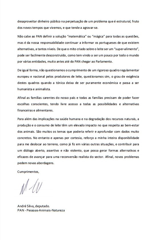 “Não cabe ao PAN definir a solução “matemática” ou “mágica” para todas as questões, mas é da nossa responsabilidade continuar a informar os portugueses de que existem alternativas, a tantos níveis. De que o mito criado sobre o leite ser um “super-alimento”, pode ser facilmente desconstruído, como tem vindo a ser um pouco por todo o mundo por várias entidades, muito antes até do PAN chegar ao Parlamento,” afirma André Silva.