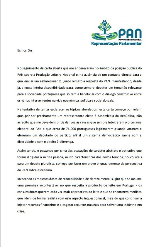 Conforme já foi comunicado a esta entidade, em carta de esclarecimento (anexa), e passando por cima de acusações vazias e de carácter abstrato e opinativo, o PAN acredita que por ter um representante eleito na Assembleia da República, deve reforçar a defesa das causas que sempre integraram o seu programa eleitoral e que cerca de 74.000 portugueses legitimaram quando votaram e elegeram um deputado do partido, sendo que, um sistema democrático ganha com a diversidade e com o direito à apresentação de diferentes perspetivas.
