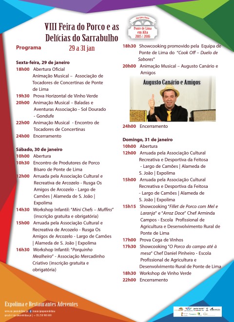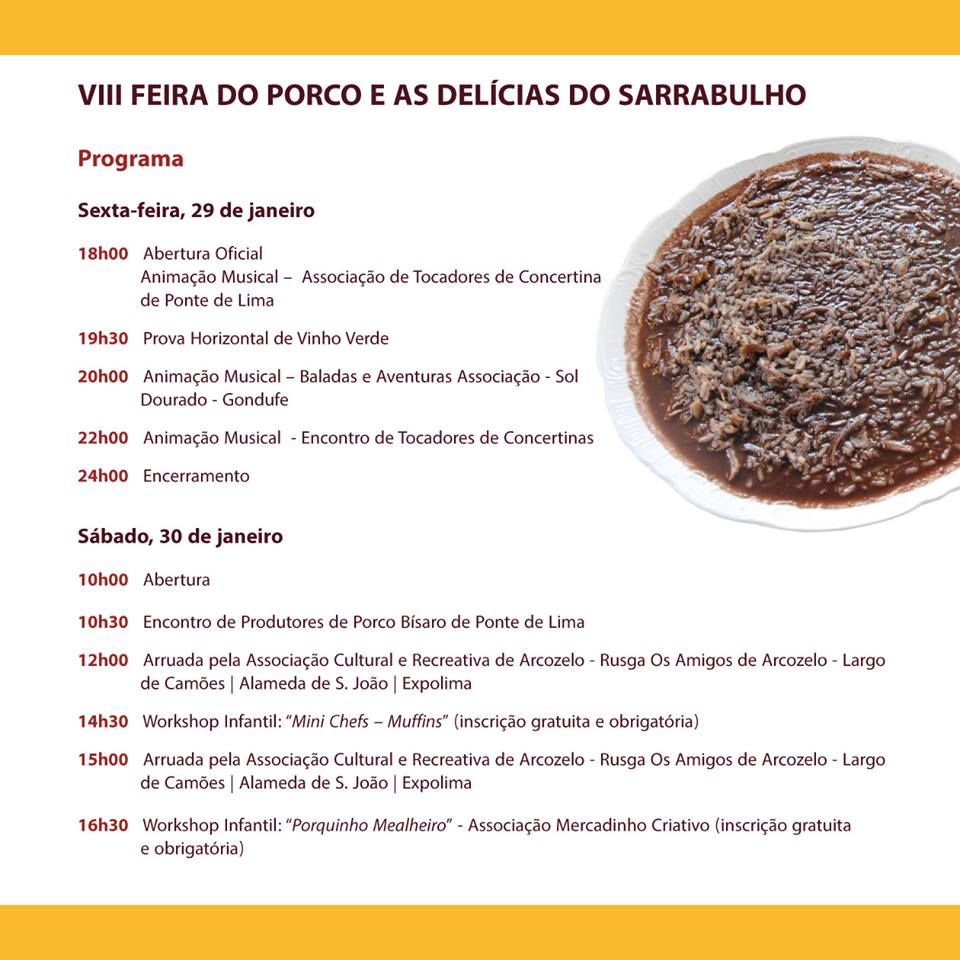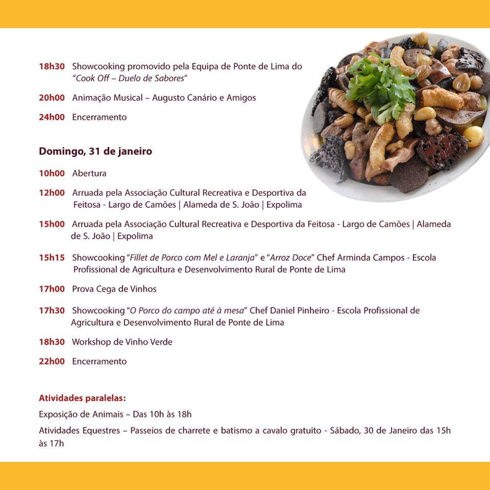 O evento consiste na organização de um variado conjunto de atividades, um espaço/venda de produtos regionais, mostra/venda de artesanato e a promoção da gastronomia típica do concelho. O programa inclui workshops infantis - “Mini Chefs – Muffins” e o “Porquinho Mealheiro”; Showcookings, pela equipa de Ponte de Lima do “Cook-Off – Duelo de sabores”; “Fillet de Porco com Mel e Laranja” e “Arroz Doce” pela Chef Arminda Campos e “O Porco do campo até à mesa” pelo Chef Daniel Pinheiro, ambos da Escola Profissional de Agricultura e Desenvolvimento Rural de Ponte de Lima. Realiza-se ainda um workshop de Vinho Verde, uma prova Horizontal de Vinho Verde e uma prova Cega de Vinhos.