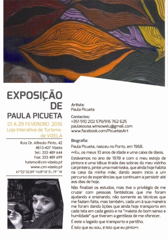 A Loja Interativa de Turismo de Vizela recebe a exposição ‘Paula Picueta’, de 1 a 29 de fevereiro.