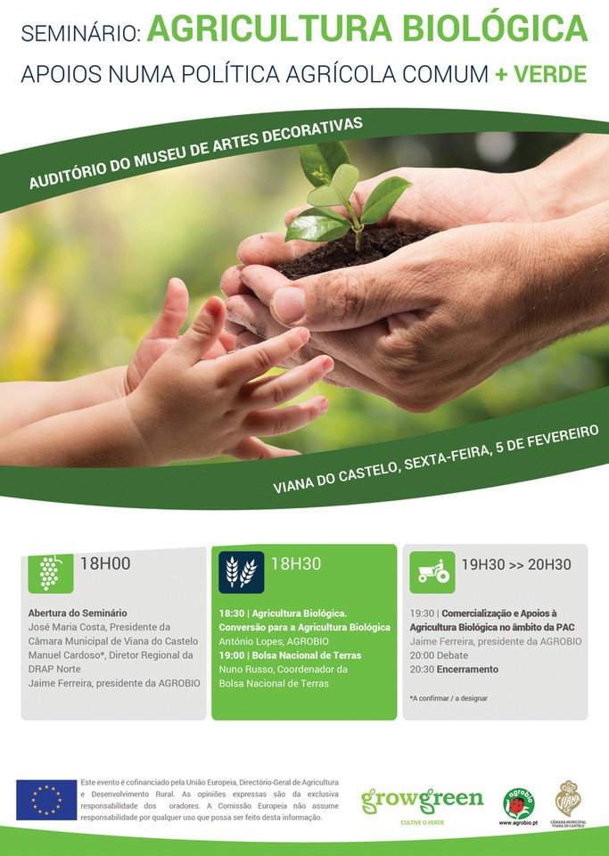 A Associação Portuguesa de Agricultura Biológica vai estar em Viana do Castelo, no dia 5 de Fevereiro, entre as 18h00 e as 20h30, no Auditório do Museu de Artes Decorativas, para um Seminário intitulado “Agricultura Biológica: Apoios numa Política Agrícola Comum mais verde”.