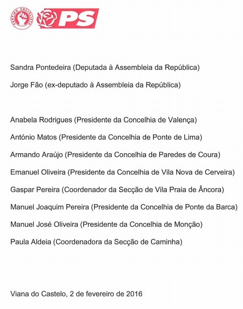 Anabela Rodrigues (Valença), António Matos (Ponte de Lima), Armando Araújo (Paredes de Coura), Emanuel Oliveira (Vila Nova de Cerveira), Manuel Joaquim Pereira (Ponta da Barca) e Manuel José Oliveira (Monção) são os presidentes de concelhia que se juntam a Miguel Alves (também ele Presidente da Concelhia de Caminha) no projeto de reforço do PS no distrito de Viana do Castelo através da candidatura do último à Federação. Ao lado do autarca socialista, estão ainda Paula Aldeia (Presidente da Secção de Caminha do PS) e Gaspar Pereira (Presidente da Secção de Vila Praia de Âncora).