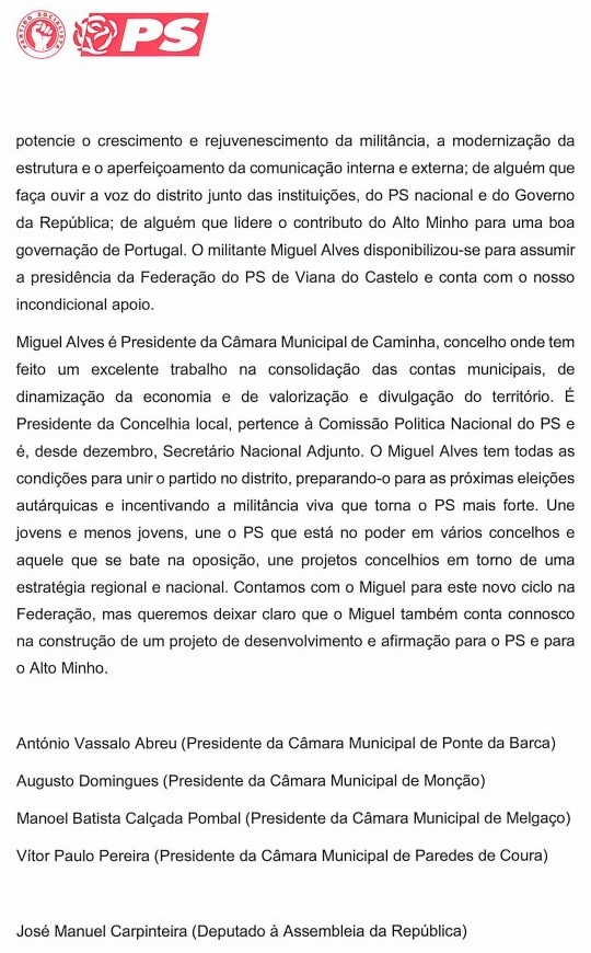 Sete Presidentes de Concelhia, cinco Presidentes de Câmara, os dois deputados à Assembleia da República, o atual Presidente da Federação do PS de Viana do Castelo e o candidato que o desafiou nas últimas eleições, declaram publicamente o seu apoio à candidatura de Miguel Alves a Presidente da Federação de Viana do Castelo do Partido Socialista.