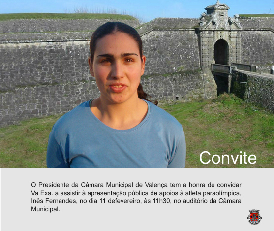 A Câmara Municipal de Valença realiza a cerimónia de apresentação pública dos apoios à atleta valenciana paraolímpica Inês Fernandes que decorrerá na próxima quinta-feira, 11 de fevereiro, às 11h30, no Auditório dos Paços do Concelho de Valença.