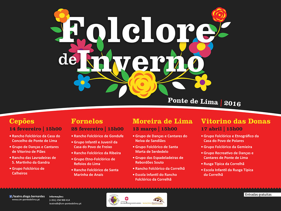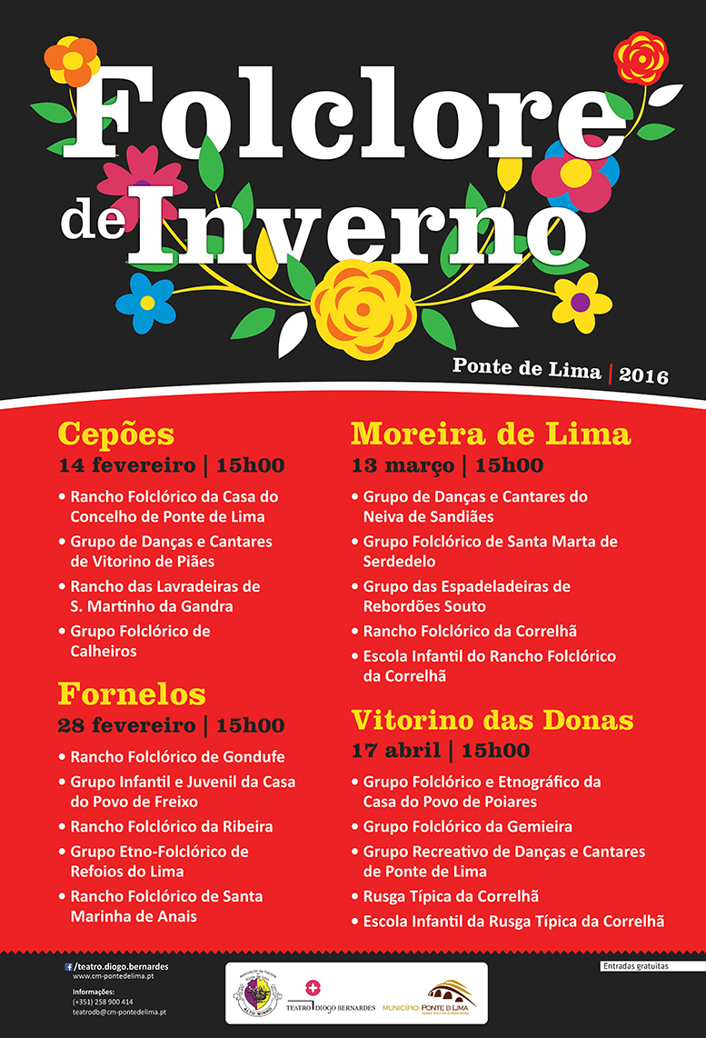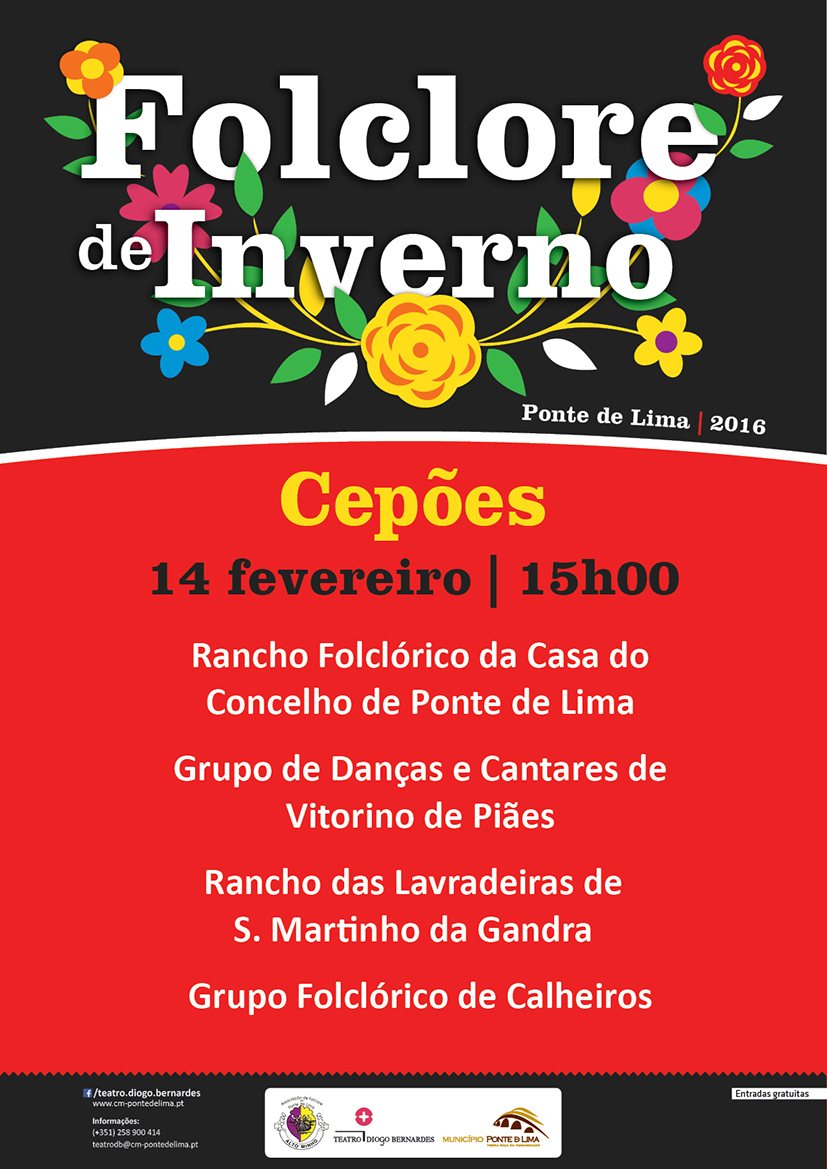 No próximo Domingo, 14 de Fevereiro, às 15h00, em Cepões – Ponte de Lima, será realizado o primeiro de quatro festivais de folclore em freguesias do concelho limiano, com entradas gratuitas, sob a designação genérica de Folclore de Inverno, dando continuidade à política de descentralização cultural que o Município de Ponte de Lima tem desenvolvido, adicionando o folclore às bandas filarmónicas, ao teatro e a outras áreas artísticas que serão divulgadas oportunamente.