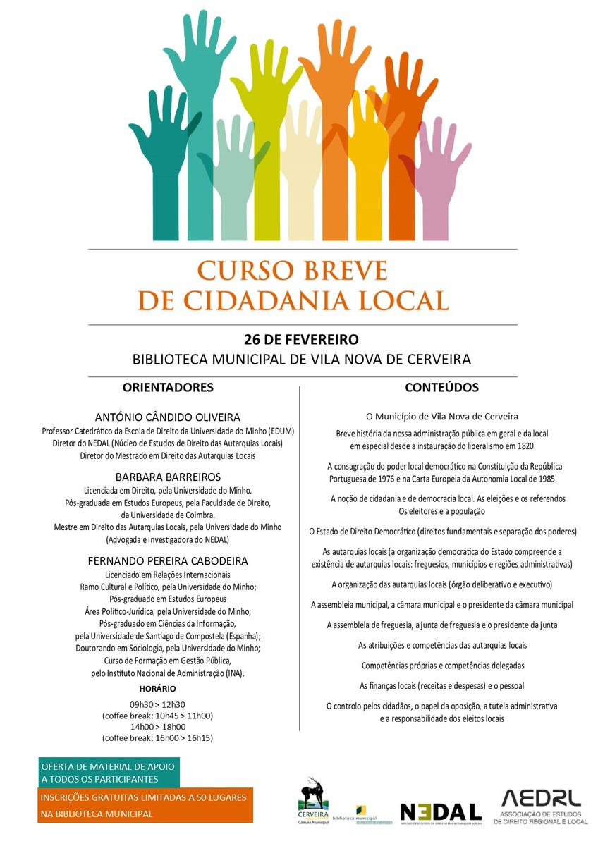 Dirigida aos cidadãos em geral, com especial atenção aos eleitos locais, professores e jovens, esta iniciativa visa dar cumprimento à Carta do Conselho da Europa sobre a Educação para a Cidadania Democrática e os Direitos Humanos.Organizada pela Associação de Estudos de Direito Regional e Local (AEDREL), este curso livre é apoiado pela Associação Nacional de Municípios (ANMP), e conta com a adesão do Município de Vila Nova de Cerveira.