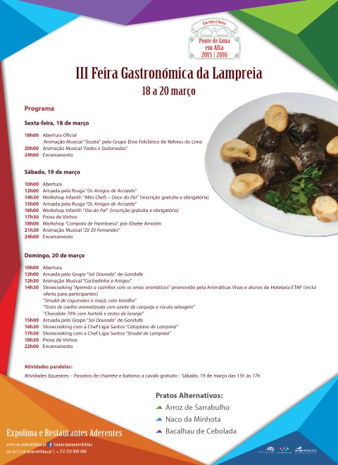 Considerando o turismo gastronómico como uma das suas principais atrações turísticas, e um fator de desenvolvimento económico e social, o Município de Ponte de Lima aposta em mais um evento gastronómico, de 18 a 20 de março, com a III Feira Gastronómica da Lampreia.