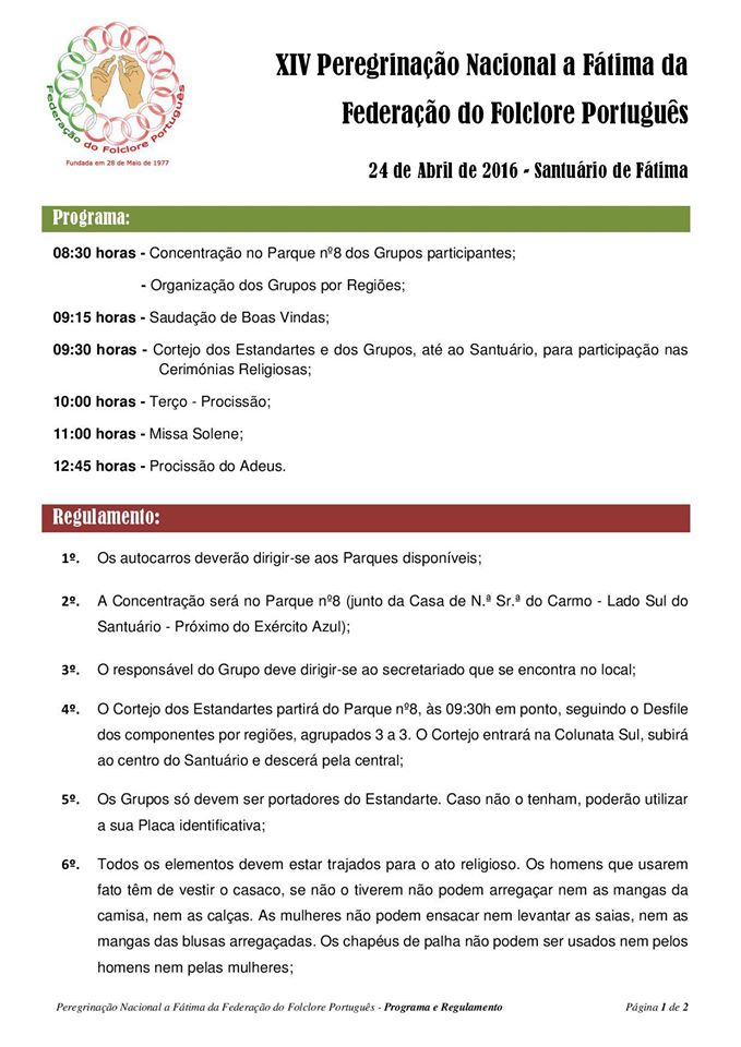 A Federação do Folclore Português está a organizar, uma vez mais a Peregrinação Nacional a Fátima dos Grupos de Folclore, onde estão desde já convidados para estarem presentes.