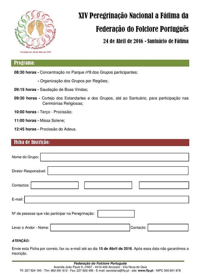 A Federação do Folclore Português disponibiliza o Programa, Regulamento e Ficha de Inscrição para a XIV Peregrinação Nacional a Fátima.