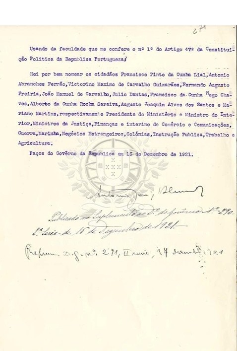 A imagem pertence ao Arquivo Histórico da Presidência da República e reproduz o Decreto de nomeação pelo então Presidente da República, Dr. António José de Almeida, do governo de Francisco Pinto da Cunha Leal, do qual fez parte Augusto Joaquim Alves dos Santos como Ministro do Trabalho, além de António Abranches Ferrão, Victoriano Máximo de Carvalho Guimarães, Fernando Augusto Freiria, João Manuel de Carvalho, Júlio Dantas, Francisco da Cunha Rego Chaves, Alberto da Cunha Rocha Saraiva e Mariano Martins, respetivamente, nos cargos de Presidente do Ministério e Ministro do Interior, Ministros da Justiça, Finanças e interino do Comércio e Comunicações, Guerra, Marinha, [Negócios] Estrangeiros, Colónias, Instrução Pública e Agricultura.