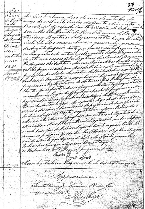 “Aos vinte e hum dias do mês de outubro do anno de mil e oito centos sasenta e seis n’esta parochial Igreja de Sancta Maria da Cabração, concelho de Ponte do Lima Diocese de Braga Primaz Baptizei Solenemente hum indevido do sexo masculino a quem dei o nome de Augusto Joaquim Santos que nasceo nesta freguesia no dia quatorze de outubro pelas quatro horas da manha do dito mês e anno folho legitimo de Manoel Joaquim Rodrigues dos Santos e Anna Maria Alves Soares natural da freguesia de Sam João da Rebeira e ele natural desta freguesia recebidos (…) de Ponte de Lima mas parochianos Proprietarios e moradores no Lugar da Igreja desta freguesia. Nepto Paterno de Antonio Jose Rodrigues dos Santos já defunto e Anna Joaquina Dantas proprietários e moradores no Lugar de Igreja que he desta freguesia e ella hoje residente na freguesia da Labruje deste concelho Materno de Antonio Jose Alves, Soares digo de Antonio Jose Alves e Mariana Luisa Soares da freguesia de Sam João da Ribeira Lugar de Crasto proprietários e forão Padrinhos o Reverendo Manoel Joaquim Soares thio do Baptizado e Maria Rosa Alves, solteira thia do Baptizado ambos da freguesia de Sam João da Rebeira Lugar de Crasto os quais todos sei serem os próprios. E para constar labrei em duplicado o prezente assento que depois de lido e conferido perante os Padrinhos comigo assinarão Era est supra.