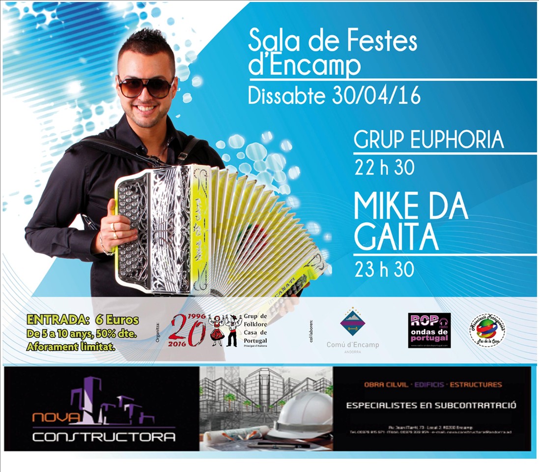 Mike da Gaita é um cantor residente em França e conta no seu reportório com três discos de ouro e uma intensa carreira musical em Portugal e França. O último trabalho discográfico chama-se “O Rei da alegria” e está composto por diferentes influências musicais da música tradicional portuguesa. A entrada para o concerto, com lotação limitada, tem um custo de 6€ e conta com a colaboração da Câmara (Comú) de Encamp.