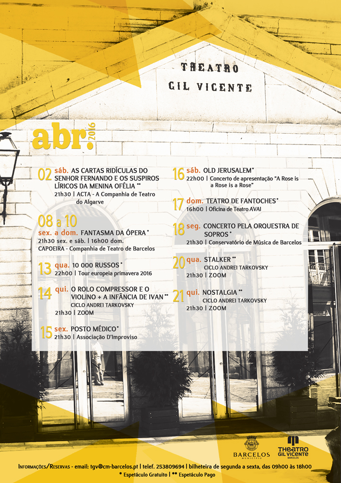 A dramatização parte da correspondência trocada entre Fernando Pessoa e Ofélia Queiroz, única amante conhecida do escritor, à qual se juntam outros textos do próprio Pessoa e outros do encenador deste espetáculo, cujo bilhete custa dois euros. De 8 a 10 de abril, o célebre texto de Gaston Leroux, “Fantasma da Ópera”, será levado a cena por Cátia Oliveira numa produção da Capoeira – Companhia de Teatro de Barcelos. As sessões, que são gratuitas, decorrem sexta-feira e sábado, às 21h30, e domingo, às 16h00. Ainda na arte da representação, no dia 15, às 21h30, sobe a palco a peça “Posto Médico”, da Associação D'Improviso, e no domingo, dia 17, a Oficina de Teatro AVAI apresenta um “Teatro de Fantoches” pelas 16h00. Ambos os eventos são gratuitos.