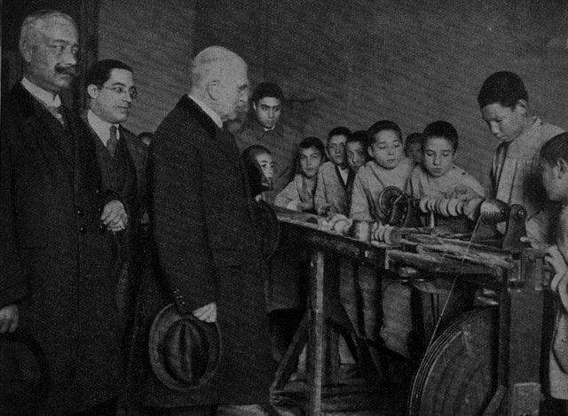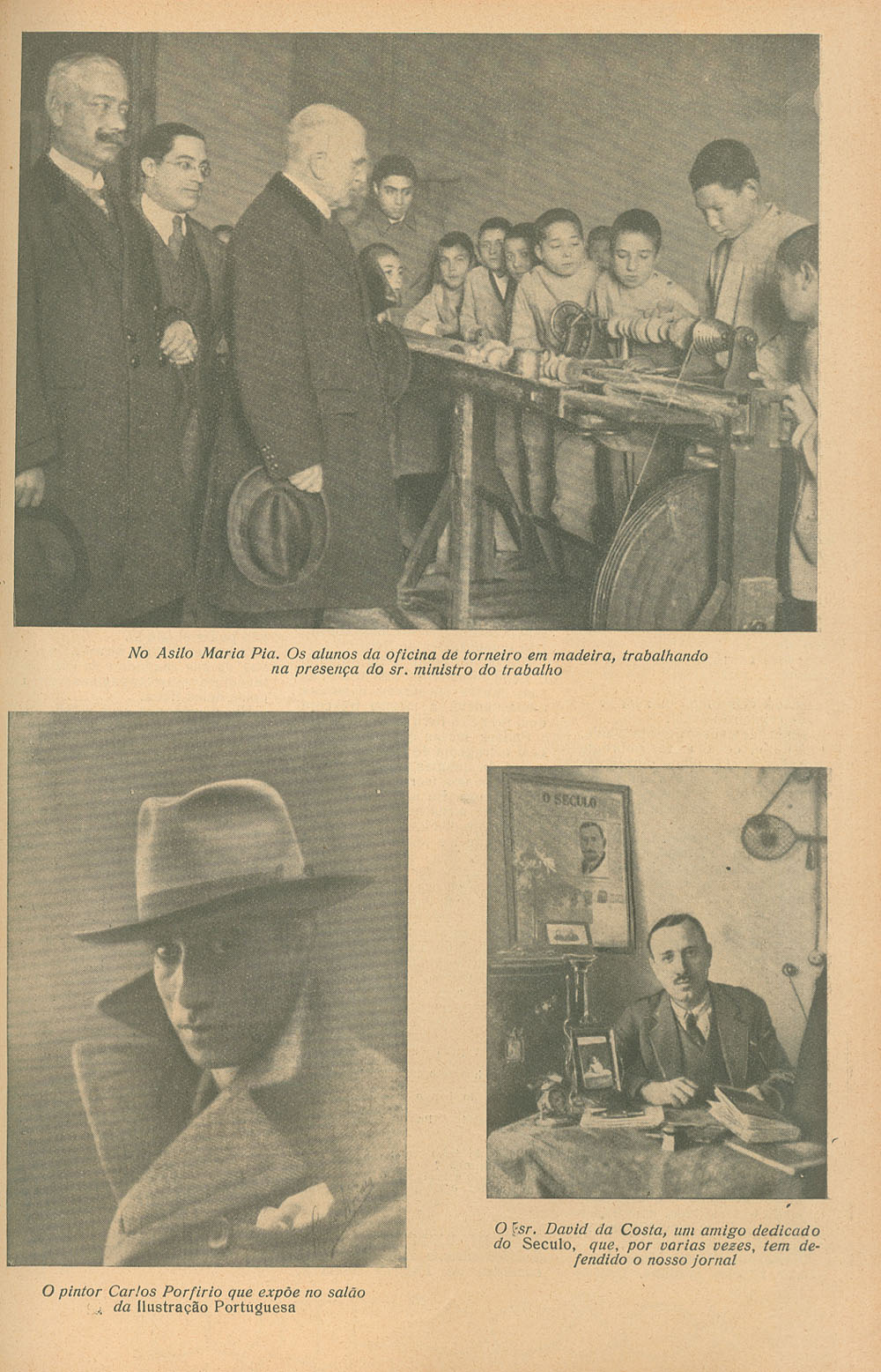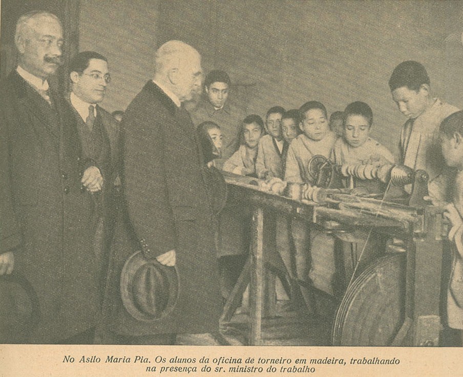 O Ministro do Trabalho Alves dos Santos numa visita à oficina de torneiro em madeira do Asilo Maria Pia. Ilustração Portuguesa n.º 832, 28 de Janeiro de 1922