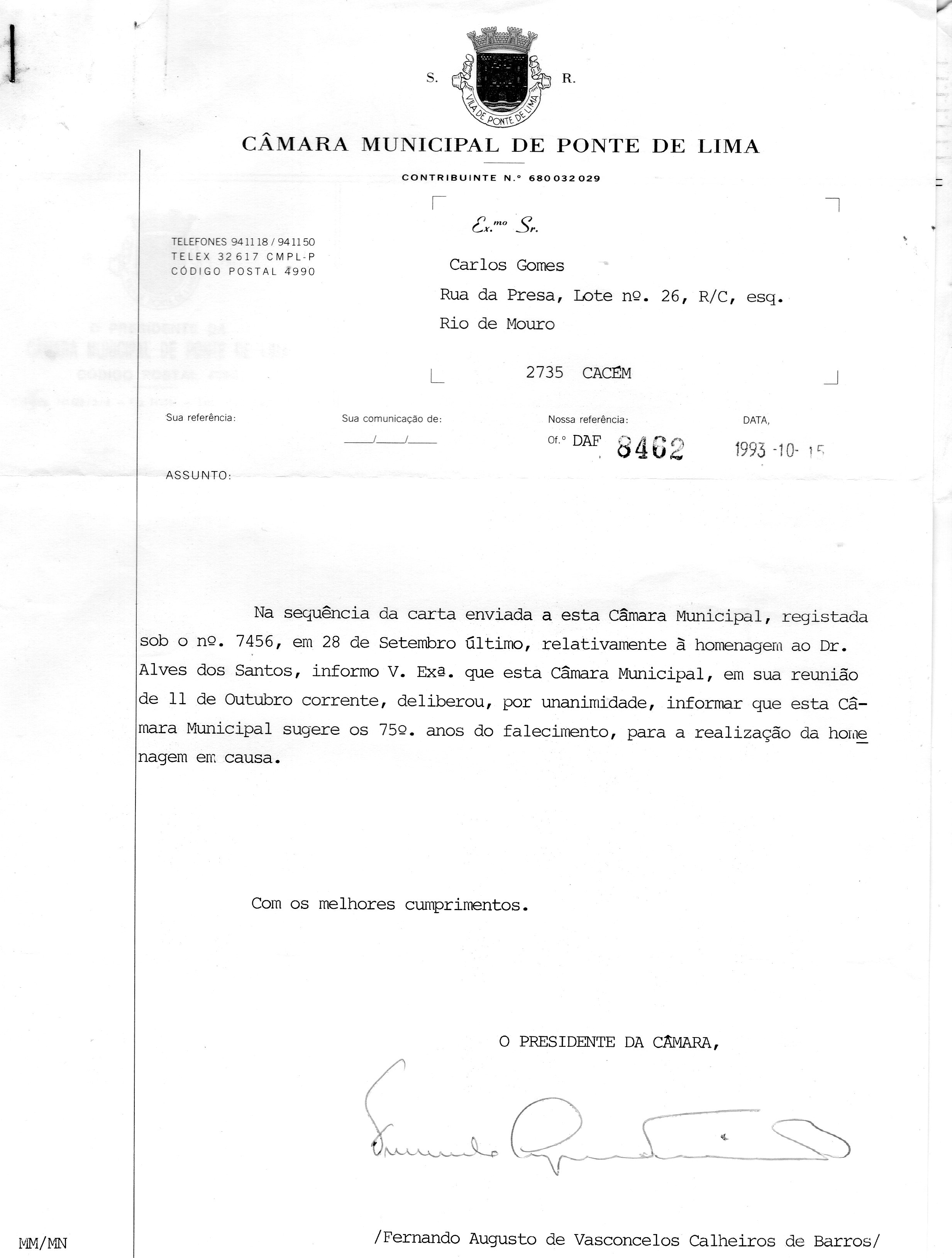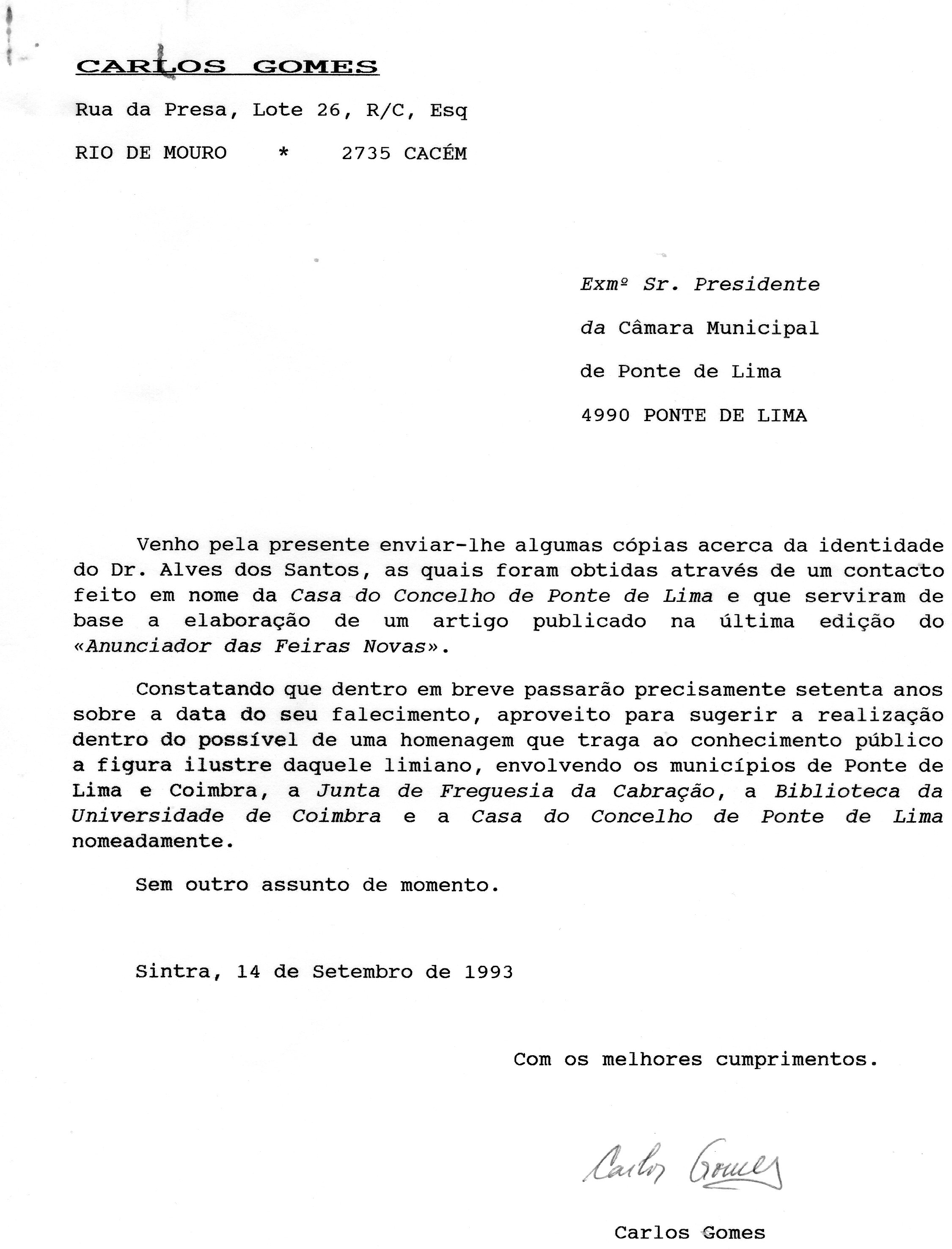 Em resposta a uma sugestão apresentada em 1993, pelo autor destas linhas, no sentido de ser organizada uma homenagem ao Dr Alves dos Santos, a Câmara Municipal de Ponte de Lima, então presidida pelo sr. Fernando Calheiros de Barros, sugeriu por unanimidade a sua realização por ocasião dos 75 anos do seu falecimento ou seja, em 1999. Não tendo a mesma sido então realizada, julgamos ser o 150º aniversário da data do seu nascimento a efeméride adequada para lembrar este grande vulto limiano. Aqui ficam as cópias da correspondência então trocada com a autarquia limiana.