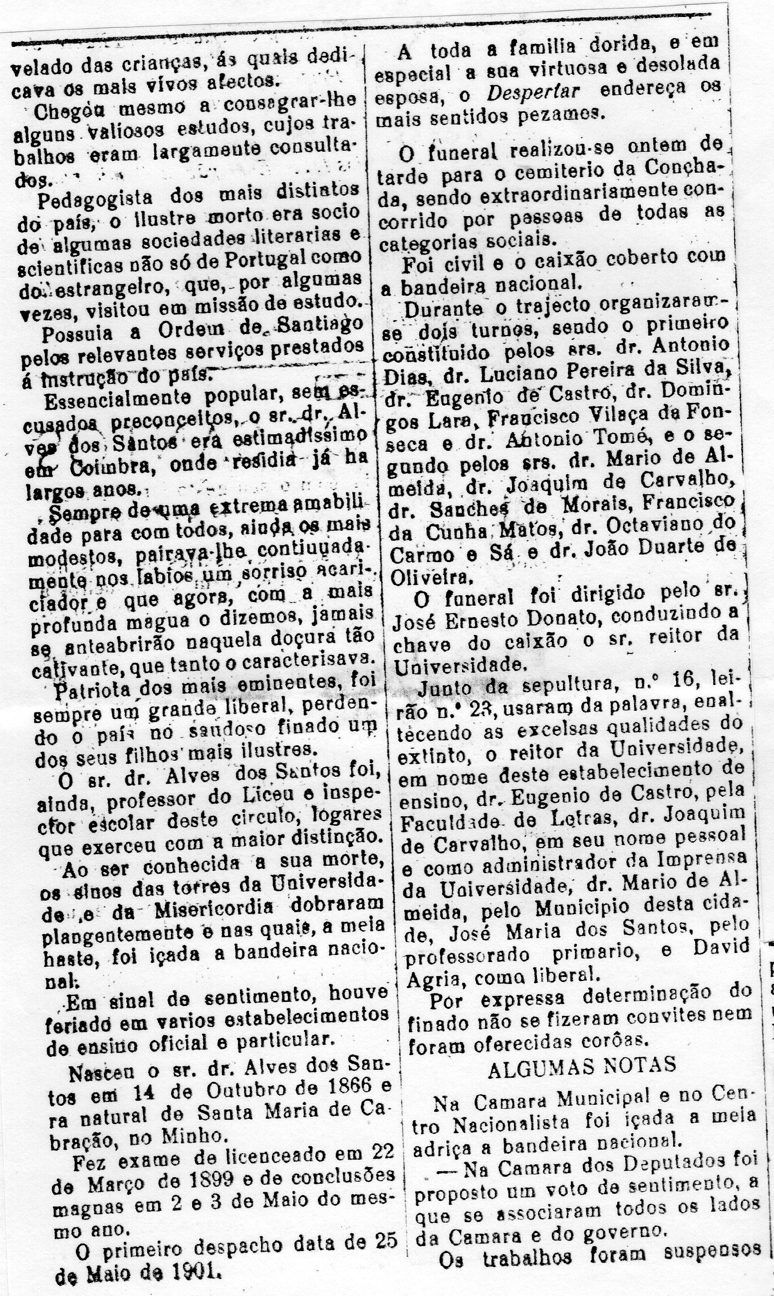 A edição de 19 de janeiro de 1924 do jornal “O Despertar”, de Coimbra, publicou a notícia do falecimento do Dr. Alves dos Santos que junto reproduzimos.