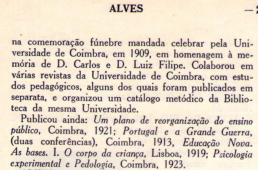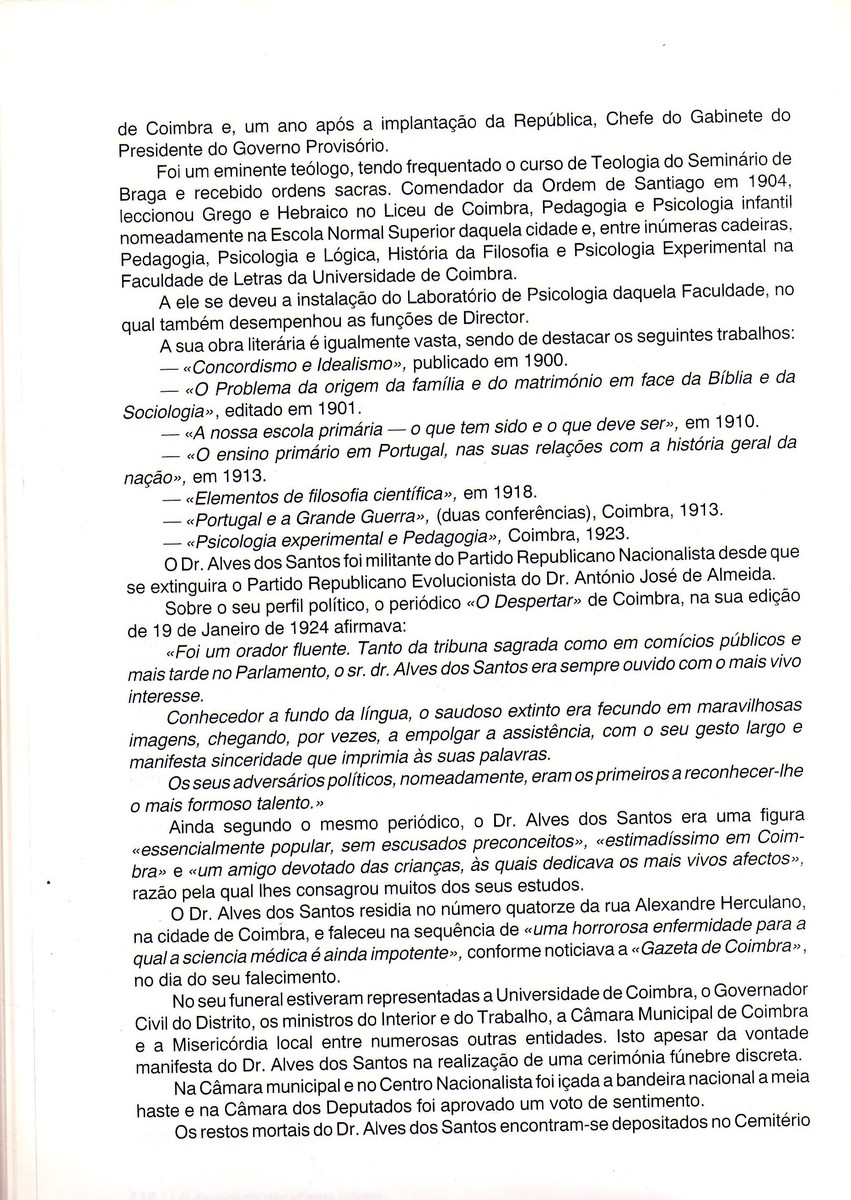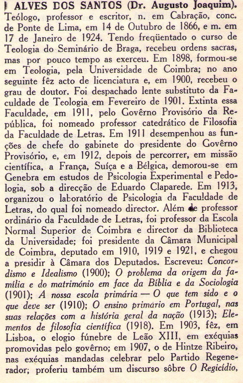 Transcreve-se o registo do Dr. Augusto Joaquim Alves tos Santos no livro “Memória Professorum Universitatis Conimbrigensis: 1772 – 1937”. Vol. II. Direção: Manuel Augusto Rodrigues. Coimbra. Arquivo da Universidade, 1992, referente aos professores de Teologia, de Letras e da Escola Normal Superior.