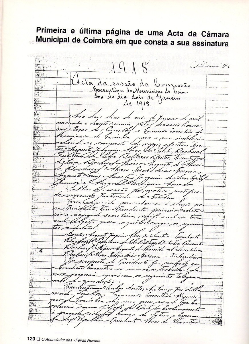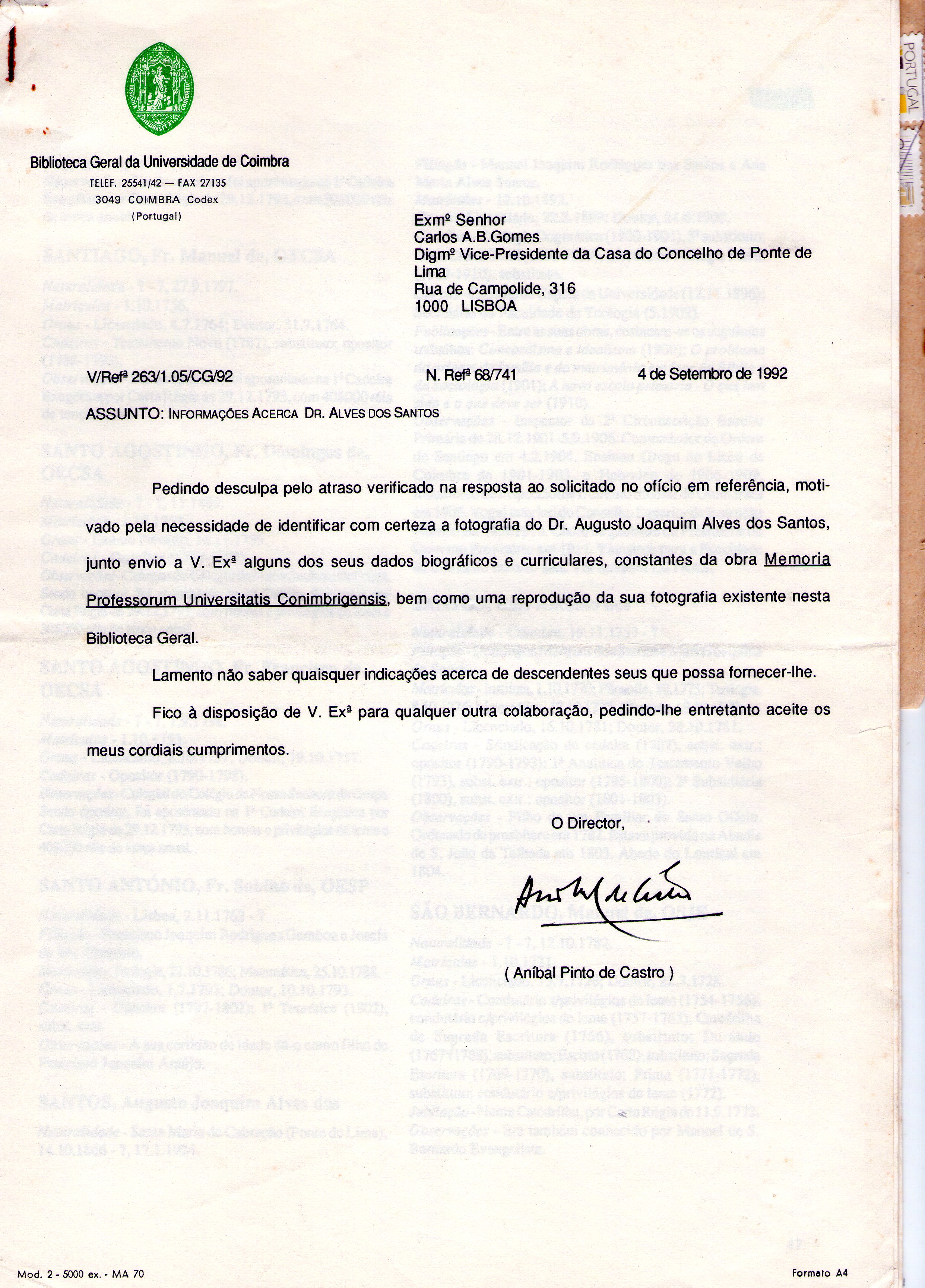 A fim de envolver a Casa do Concelho de Ponte de Lima num projeto de interesse cultural, o autor destas linhas efetuou quase desde o início alguns pedidos de informação em nome daquela Instituição regionalista, razão pela qual algumas entidades respondem-lhe diretamente. É o caso da Câmara Municipal de Coimbra que presta algumas informações acerca de Augusto Joaquim Alves dos Santos, através do ofício que junto se reproduz.