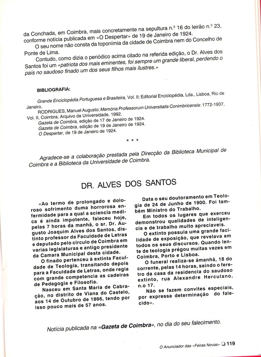 A edição de 17 de janeiro de 1924 do jornal “Gazeta de Coimbra” noticiou o falecimento do Dr. Alves dos Santos, no próprio dia do nefasto acontecimento.