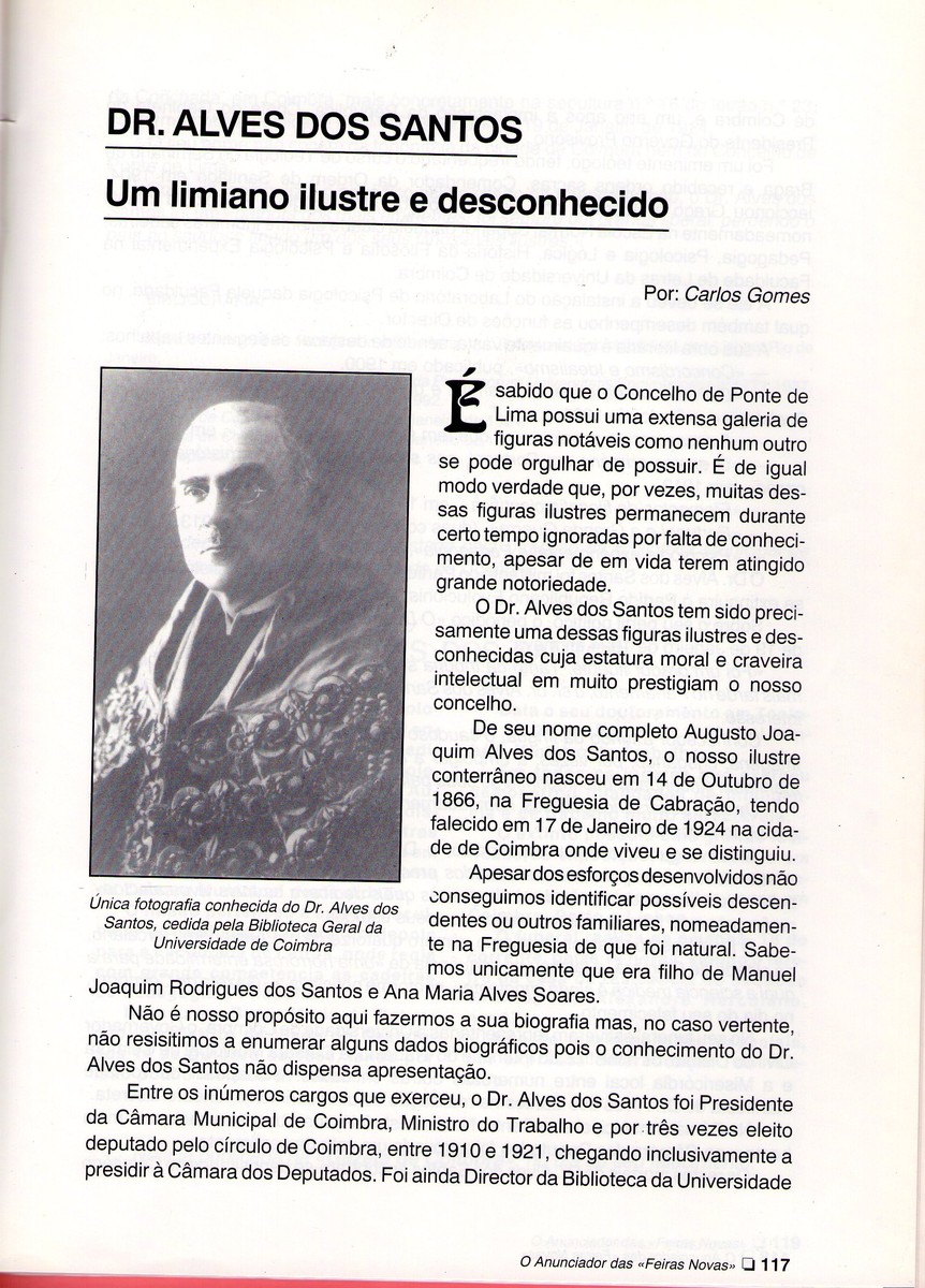 Até ao surgimento do BLOGUE DO MINHO, foi a revista “O Anunciador das Feiras Novas” a primeira e única publicação periódica em Ponte de Lima a dar a conhecer a figura do ilustre limiano que foi o Dr. Augusto Joaquim Alves dos Santos. As imagens que se reproduzem correspondem à edição de 1993 onde foi publicado o primeiro de vários artigos.