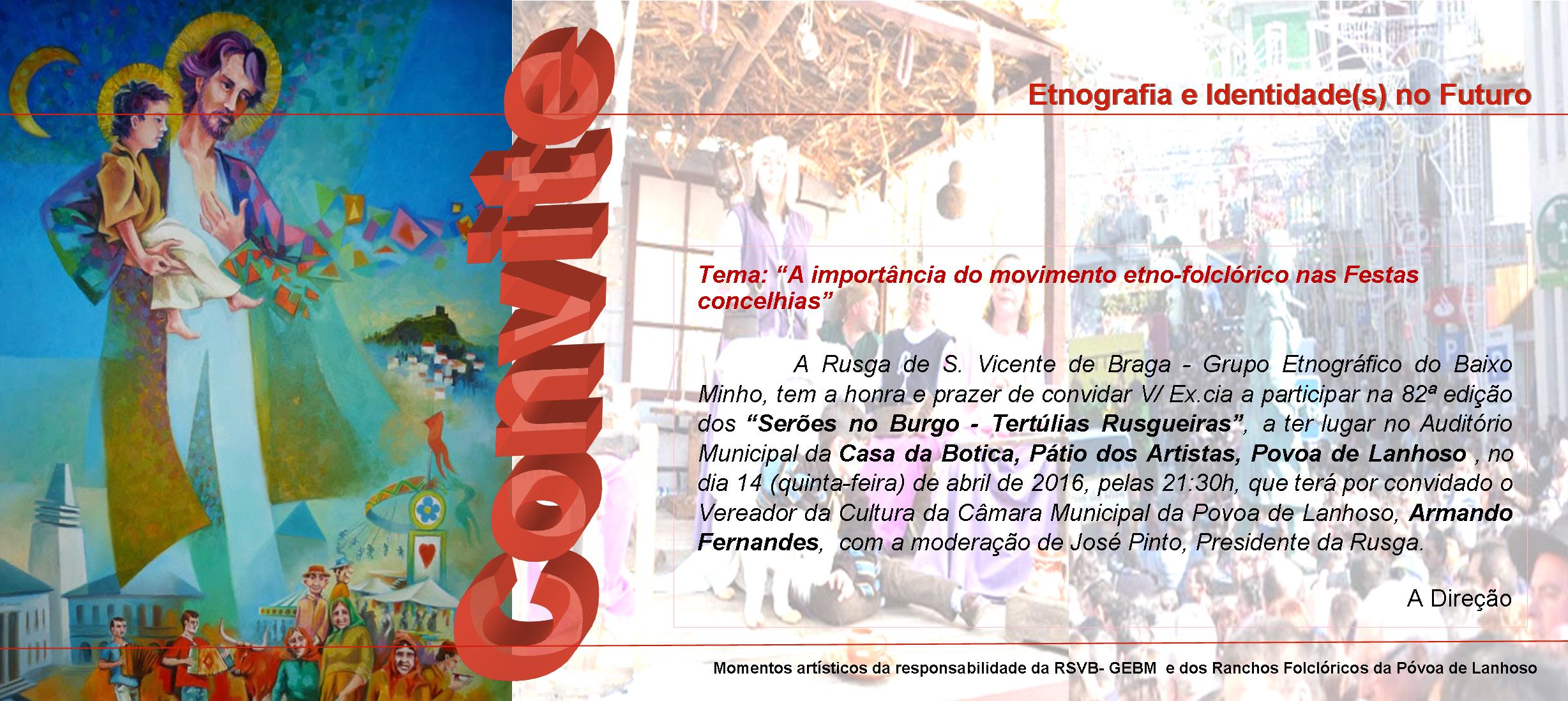 A Rusga de São Vicente de Braga - Grupo Etnográfico do Baixo Minho, tem a honra e prazer de convidar V/ Ex.cia a participar na 82ª edição dos "Serões no Burgo/Tertúlias Rusgueiras", a ter lugar na Casa da Botica, Pátio dos Artistas, Povoa de Lanhoso, no próximo dia 14, quinta-feira, do mês em curso, pelas 21h:30, que terá por convidado o Dr. Armando Fernandes, Vereador da Cultura da Câmara Municipal da Povoa de Lanhoso, com a moderação de José Pinto, presidente da associação.