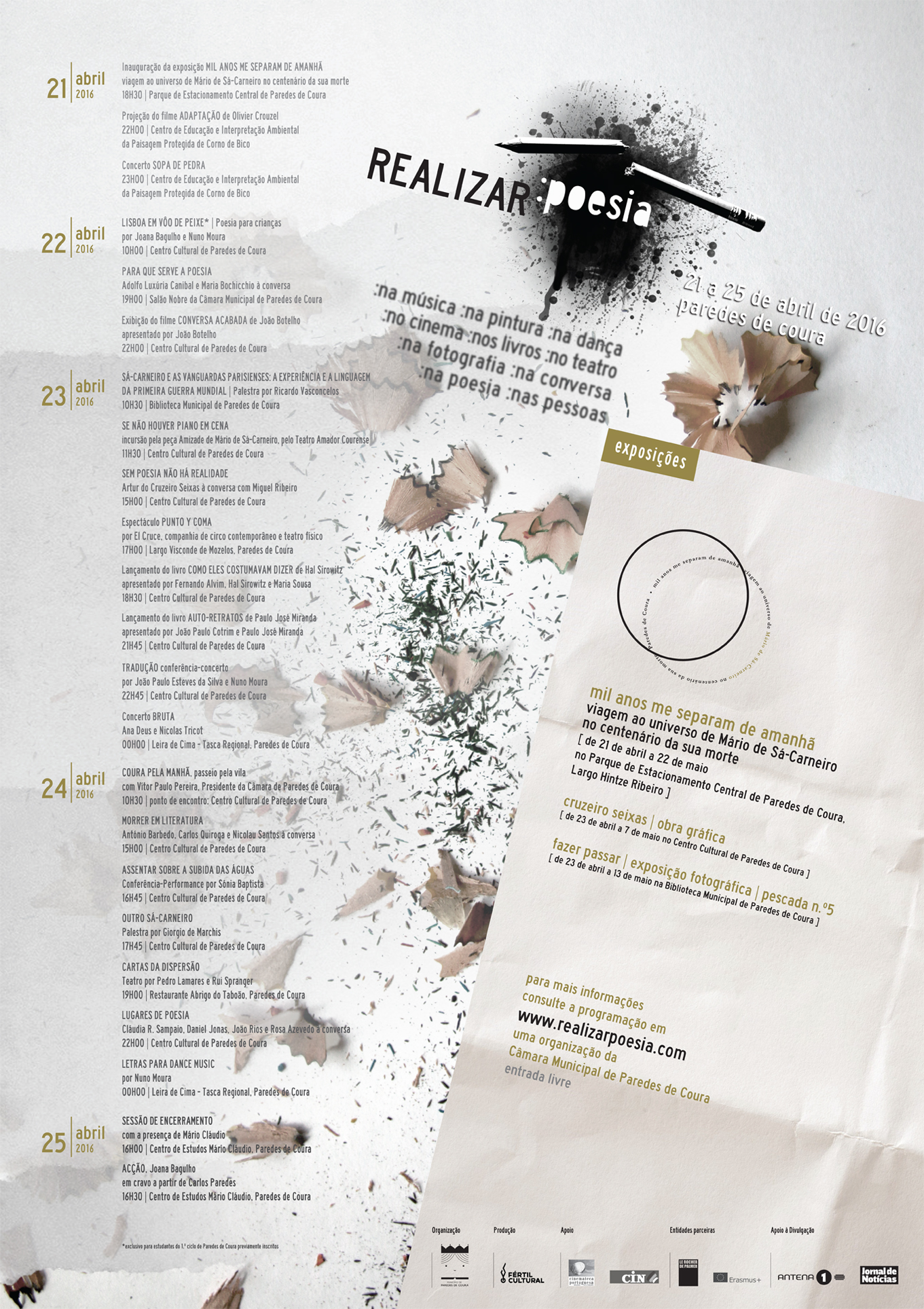 “Mil anos me separam de amanhã”, uma viagem ao universo de Mário de Sá-Carneiro no centenário da sua morte, bem como conversas, teatro, lançamento de livros, cinema, circo contemporâneo, concertos e dança – performance completam o REALIZAR : poesia, que de 21 a 25 de abril convoca a poesia ao desiderato novo de participação na realidade, anima os diversos momentos deste primeiro evento, que terá o privilegiado âmbito de Paredes de Coura como cenário.