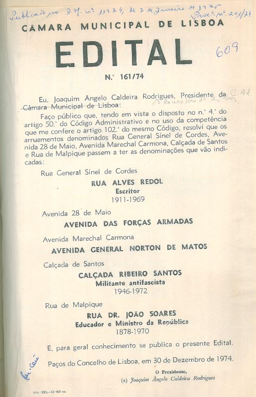Após o 25 de Abril de 1974, a Câmara Municipal de Lisboa então gerida por uma Comissão Administrativa presidida pelo Eng.º Caldeira Rodrigues, mudou na toponímia da capital apenas 5 topónimos, de acordo com o parecer da Comissão Municipal de Toponímia na sua primeira reunião (15/11/1974), que defendia a «Necessidade de eliminação dos nomes afrontosos para a população, pela sua última ligação ao antigo regime» e assim, por edital de 30 de dezembro de 1974, foram alterados os seguintes topónimos: a Avenida Vinte e Oito de Maio passou a Avenida das Forças Armadas, a Rua General Sinel de Cordes tornou-se a Rua Alves Redol, a Calçada de Santos alterou-se para Calçada Ribeiro dos Santos, a Estrada de Malpique converteu-se na Rua Dr. João Soares e, a Avenida Marechal Carmona foi transformada em Avenida General Norton de Matos.