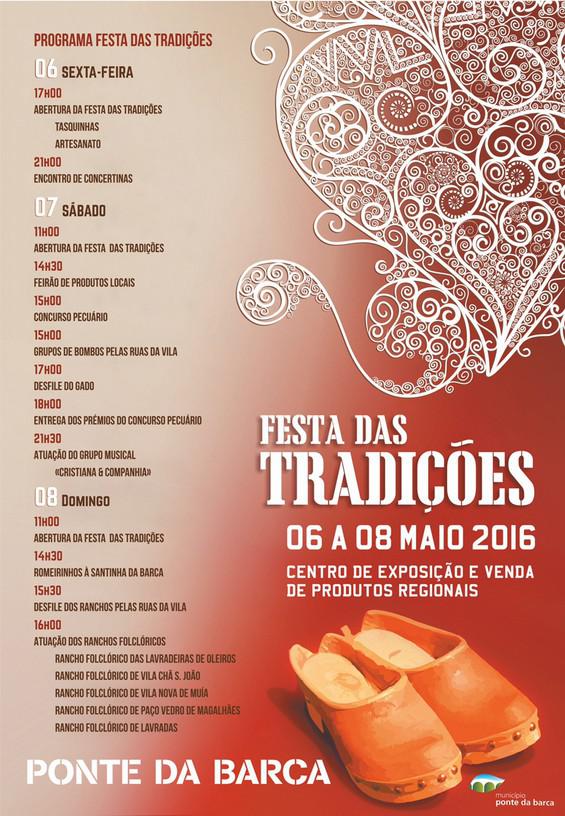 O programa da edição 2016 da Festa das Tradições conta com um conjunto de iniciativas que muito caracterizam o concelho de Ponte da Barca como o artesanato, as danças e cantares regionais com Ranchos Folclóricos, Rusgas, Grupos de Bombos eEncontro de Concertinas, o Feirão de produtos locais e a gastronomia onde não vão faltar os tradicionais petiscos, tais como o caldo verde, o caldo de farinha, o bacalhau frito, o chouriço assado, a massa à lavrador ou o arroz de feijão, regados pelo distinto vinho verde da região. Este ano como novidade decorre também o Concurso Pecuário de gado barrosão, que tem no município de Ponte da Barca o maior número de exemplares.