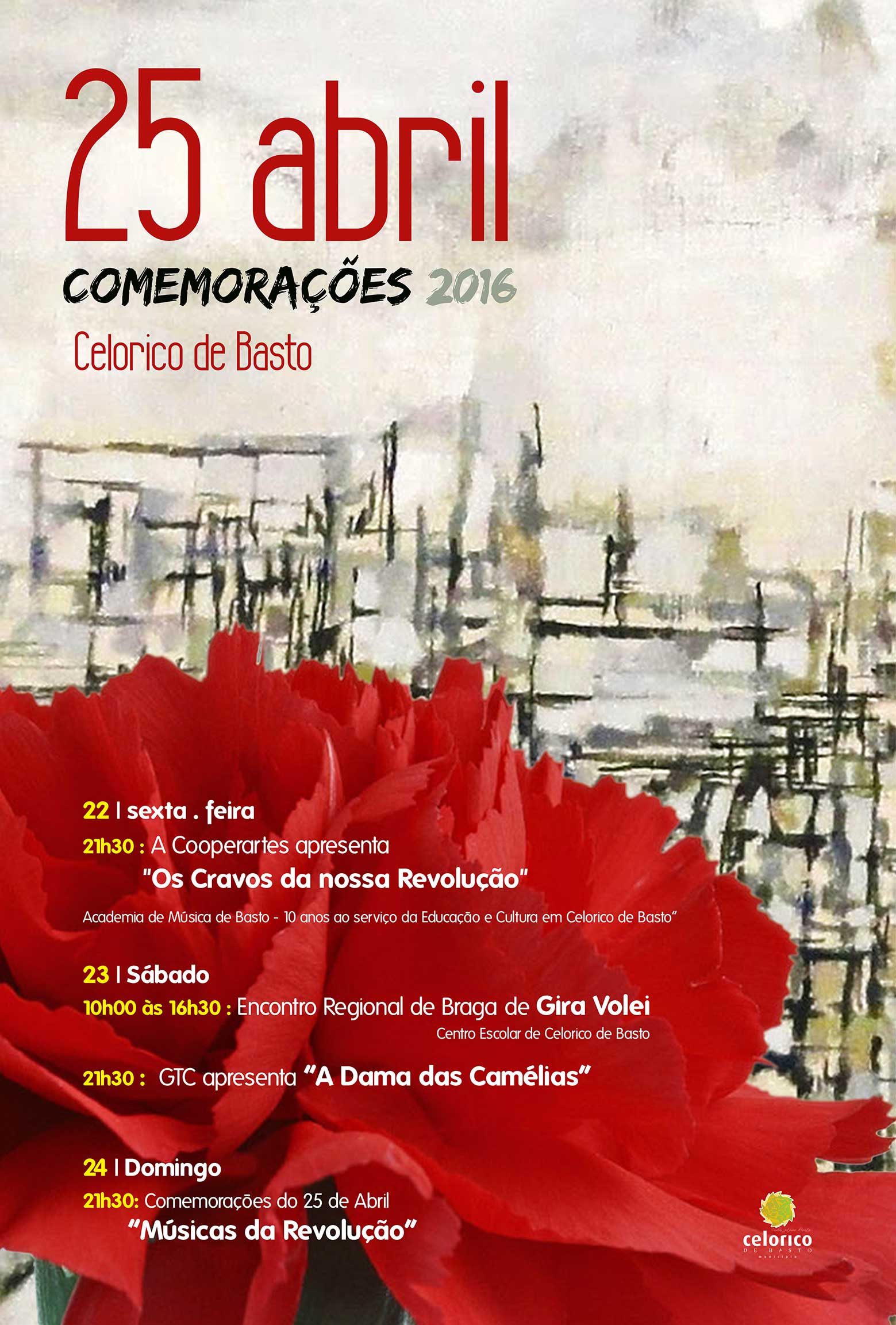 Celorico de Basto mantém uma das atividades promovidas nas celebrações dos “40 anos da Revolução” em 2014, as Músicas da Revolução, interpretadas por cantores, bandas e grupos de música locais, no dia 24 de abril. A ação é sempre muito apelativa junto da comunidade local. Este ano, as celebrações do “25 de Abril” contam também com a atuação da Cooperartes que apresenta, no dia 22 de abril. “Os Cravos da Nossa Revolução”. No sábado, 23 de abril, destaque para a Peça de Teatro “A Dama das Camélias”. Estas atividades estão todas marcadas para as 21h30, no Centro Cultural Prof. Doutor Marcelo Rebelo de Sousa. Paralelamente a estas ações culturais irá decorrer, no sábado, 23 de abril, o Encontro Regional de Braga de Gira-Volei, das 10h00 às 16h30, no Centro Escolar de Celorico de Basto.